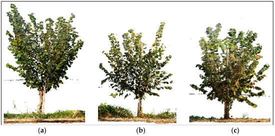 The selected morphological traits and morphological indexes can also be used on young plants, which have not reached the adult age and show small size and adult ones, similar to those in this study, since LiDAR tree point cloud represents the above-ground parts of the tree, where tree canopy is the main part of the tree, because it holds the tree branches (Figure 7 and Figure 8), leaves and, in adult old stages, the flowers and the fruits []. On young hazelnut trees, morphological traits can be used to monitor the branch and trunk growth, comparing traits such as BBD, BBS and TS over the years, as already suggested for forest trees [].