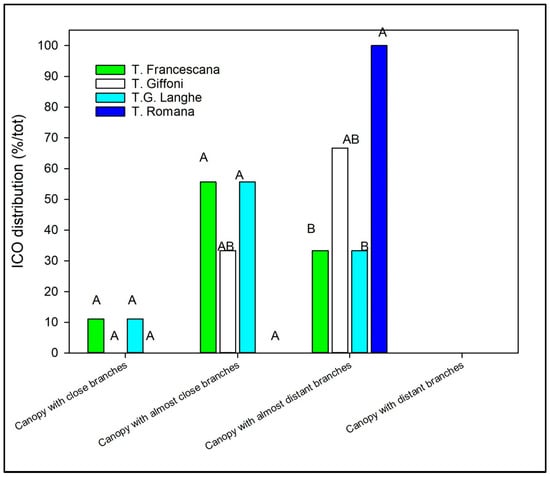 - ICO was used to define the canopy habit, expressed as the number of branches falling in each class relative to the total. If ICO was <0.35, the canopy was classified as “canopy with close branches”; ICO between 0.35 and 0.45 indicated a “canopy with almost close branches”; ICO between 0.45 and 0.55 indicated “canopy with almost distant branches”; and ICO > 0.55 indicated a “canopy with distant branches”;