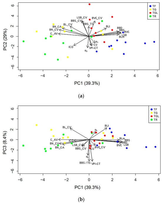 PC1 primarily differentiates cultivars based on canopy and branch volume-related traits. Cultivars positioned towards the right (TGL and TF) exhibit more vigorous canopy structures and thicker branches, suggesting increased structural robustness. Conversely, cultivars like TG and TR, positioned towards the left, are associated with higher canopy openness and a more dispersed branching structure (BN_CA, C_AV, BL_CV, ICO). PC2 further refines these differences by capturing branch surface area and structural development. TGL, with higher PC2 values, is driven by traits such as LSB_CV, BBS_CV, and BVC_CV, which indicate a greater branch surface area and a more expansive canopy architecture. In contrast, TF, which is positioned towards lower PC2 values, is associated with α2, suggesting a more upright branching structure and a compact growth habit, which could be beneficial in high-density planting systems. A clearer distinction between TG and TR is observed along PC3, where VPI-CT, BBS_TS and α2 primarily contribute to their separation along this axis, related to a different canopy shape (VPI-CT and α2), and a less trunk vigour (BB_TS). Overall, PCA distinguishes cultivars based on morphological traits and morphological indexes, providing insights into their potential adaptability to different environmental conditions and management strategies.