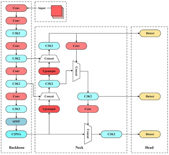 As shown in Figure 4, YOLOv11n adopts a classic three-stage architecture design. In the backbone, a deep convolutional neural network is used to extract multi-scale features, and three feature maps of different dimensions are output. In the neck, a feature pyramid structure is adopted to achieve cross-scale feature fusion, effectively enhancing the semantic information interaction between high-dimensional and low-dimensional features. In the detection head, prediction results are generated based on the anchor-box mechanism.
