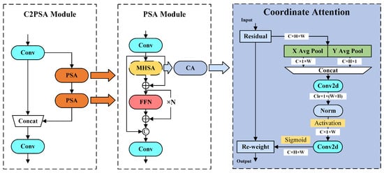 In the backbone, this study integrates the CA mechanism proposed by Hou Q et al. [37] to optimize the model’s multi-scale representation ability. As shown in Figure 6, the C2PSA module located at the terminal of the backbone relies on the multi-head self-attention (MHSA) mechanism to achieve cross-scale feature interaction. However, the MHSA mechanism has high computational complexity when processing high-resolution images and is prone to missing local details. Therefore, the MHSA mechanism is replaced with the CA mechanism. A bidirectional coordinate encoding is employed to establish precise positional perception. By decomposing the input vector, the computational load is reduced and the inference speed is improved.