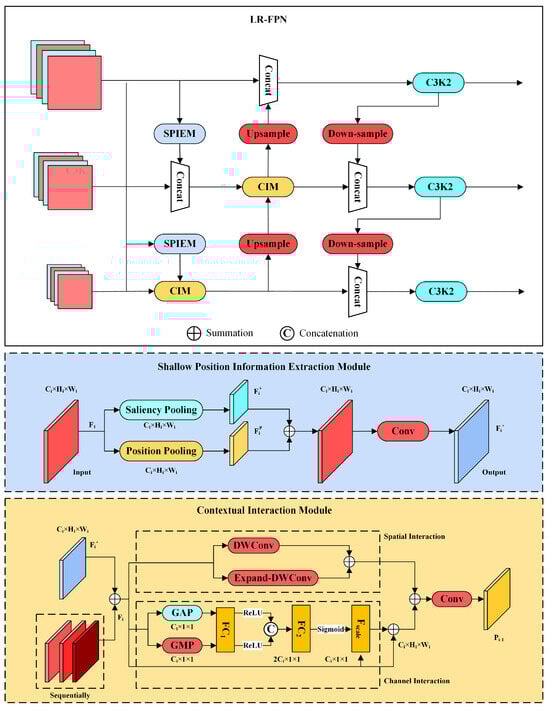 The function of the feature pyramid network is to fuse the input multi-scale features. The traditional FPN does not consider spatial information during the fusion process and lacks sufficient analysis of the correlations between different levels. When dealing with low-level features, it often fails to make full use of the shallow position information due to the vanishing gradient problem. Therefore, we introduce the location-refined feature pyramid network (LR-FPN) proposed by Hanqian Li et al. [38] to reconstruct the neck network of YOLOv11n. The network structure of the LR-FPN is illustrated in Figure 7.