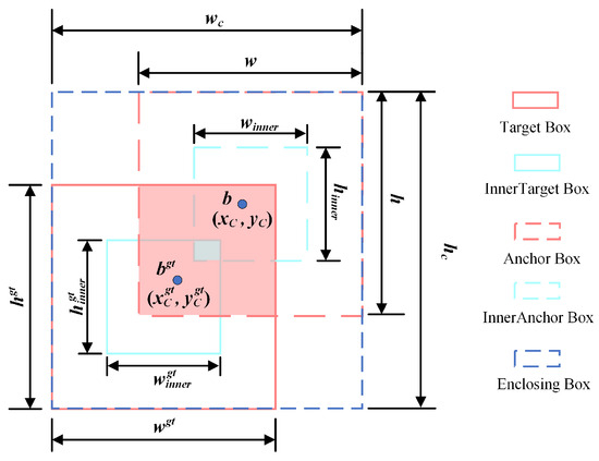 In Equation (10), and are the width and height of the smallest enclosing rectangles of the anchor box and the target box, respectively. The principle of the inner EIoU is shown in Figure 9. The inner EIoU dynamically adjusts the gradient according to the specified ratio factor and generates auxiliary bounding boxes inside the anchor box and the target box to penalize the regression results, overcoming the possible function degradation problem in the CIoU. The auxiliary boxes can further enhance the aspect ratio of the anchor boxes, alleviating the sensitivity of small object regression. Meanwhile, they provide effective gradients for the generation of prediction boxes, assisting the LP solver in approaching the global optimal solution more rapidly.
