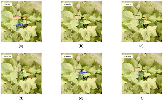 This demonstrates that the prediction box output by YOLOv11n more accurately covered the area where the top bud was located, and the proportion of redundant pixels within the prediction box was relatively small. The division of the ROI was more accurate than that of other algorithms. Figure 11 shows the output results of the six micro-sized models on the same image.