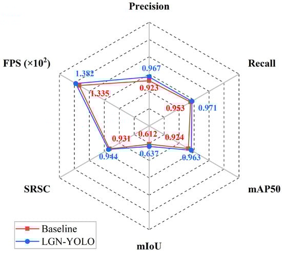 In Table 4, Group 1 does not include any additional modules and serves as the baseline model, while Group 5 represents LGN-YOLO. By comparing Group 1 and Group 2, it is evident that the introduction of the CA mechanism increased the precision by 1.9% and the mAP by 1.6%. The improvement in the accuracy of the anchor boxes effectively avoided risks such as false detections. While accurately detecting young leaves, it also provided more accurate guidance for the prediction boxes. After introducing the CA mechanism, the SRCR increased by 0.2%, and the ratio of the ROI to the whole image was further reduced. According to the FPS, the inclusion of the CA mechanism did not significantly increase the computational complexity of the model. By comparing Group 1 and Group 3, it is evident that the reorganized LR-FPN structure achieved better lightweight performance, increasing the algorithm’s FPS by 10.7 frames. The precision and recall of Group 3 improved by 1.5% and 0.7%, respectively, compared to the baseline model, indicating that this structure effectively enhances the model’s ability to distinguish the orientation of young leaves. This further strengthened the constraints during ROI generation, leading to improvements of 0.9% and 0.6% in the mIoU and SRCR, respectively. The difference between Group 4 and Group 5 is that the latter utilizes the inner EIoU as the loss function. As the FPS of Group 5 dropped by six frames, it can be seen that the newly introduced loss function increased the computational load. However, since the inner EIoU can dynamically adjust the gradient, the size penalty mechanism for the anchor boxes corrected the loss component, enabling the model to achieve a 0.9% improvement in detection accuracy at the cost of a small amount of computation and further increasing the compression ratio of the prediction boxes by 0.4%. As shown in Figure 12, the improved model demonstrates comprehensive performance enhancements compared to the baseline.