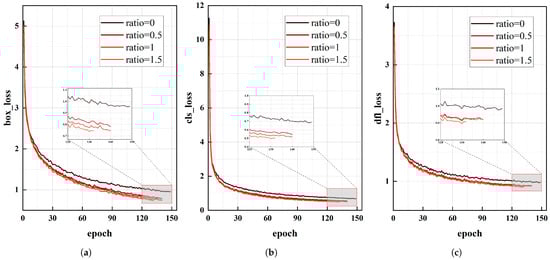 By comparing the FPS values of the experimental groups in Table 5, it is evident that varying the size of the auxiliary box did not impact the model’s computational complexity. A comparison between the first and fourth experimental groups reveals that when the ratio was set to 1.5, the accuracy of the anchor boxes increased by 0.9%, and the mIoU and SRCR of the prediction boxes improved by 0.4%. This indicates that the enhancement effect of the inner IoU grew as the ratio factor increased. Analyzing the mAP values of the second, third, and fourth groups shows that the improvement in accuracy reached a plateau as the ratio increased. Specifically, each 0.5 increment in the ratio resulted in less than a 0.1% increase in the mAP. Figure 13 illustrates the changes in the classification loss, box loss, and distribution focal loss during model training with different ratio values. When the ratio was 1.5, the loss values converged the fastest and to the lowest levels, indicating optimal classification and regression performance. Therefore, in this study, the ratio for the inner EIoU was set to 1.5.