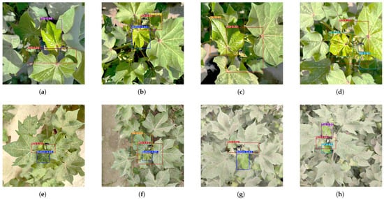 ROI generation results under different conditions: (a) Covered bud collected with a single leaf on a sunny day; (b) Covered bud collected with multiple leaves on a sunny day; (c) Uncovered bud collected with a single leaf on a sunny day; (d) Uncovered bud collected with multiple leaves on a sunny day; (e) Covered bud collected with a single leaf in dusty weather; (f) Covered bud collected with multiple leaves in dusty weather; (g) Uncovered bud collected with a single leaf in dusty weather; (h) Uncovered bud collected with multiple leaves in dusty weather.