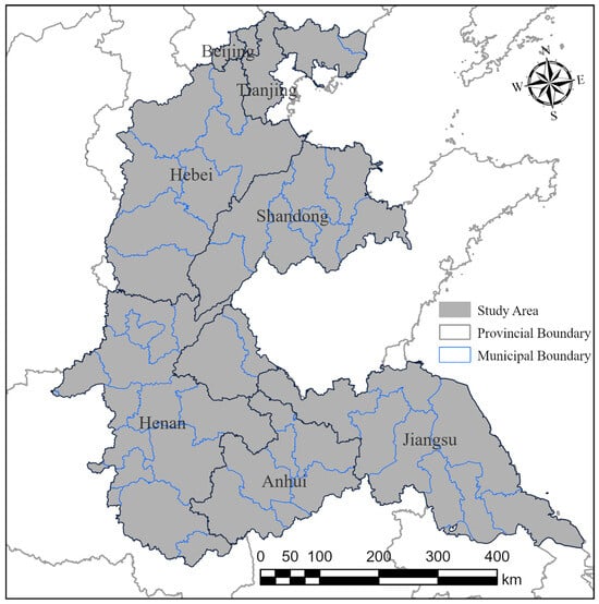 The HHH Plain is located between 32–40° N and 114–121° E, encompassing the regions of Beijing, Tianjin, southern Hebei Province, eastern Henan Province, western Shandong Province, northern Jiangsu Province, and northern Anhui Province (Figure 1). The area is characterized by flat terrain, abundant rivers and lakes, and a monsoon climate that provides favorable light and heat conditions []. The primary crops cultivated in the region are wheat, corn, and soybeans.