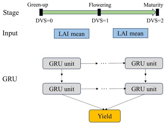 A GRU is able to capture the relationship between temporal features and has been successfully used for crop yield estimation []. In this study, the GRU construction and optimization approach follows previous research [,]. The data samples are divided into a training set and a validation set in a 9:1 ratio, and the optimal GRU parameters are determined using the Adam optimizer. The GRU model structure is shown in Figure 3.