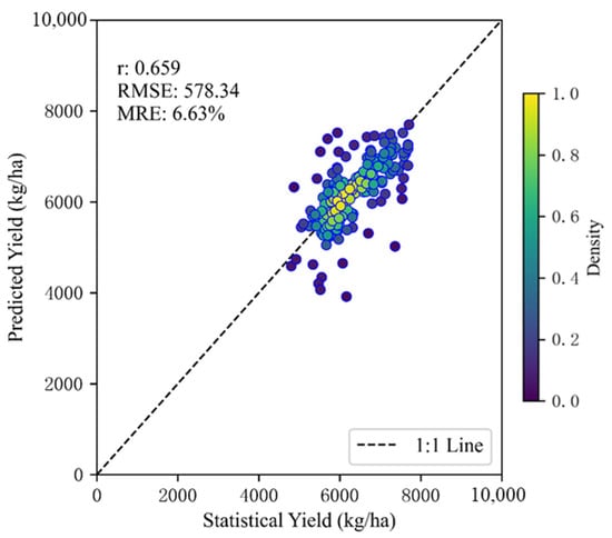 In this study, winter wheat yield distribution data for the HHH Plain from 2014 to 2022 were generated. Yields for 2014–2016 were derived from Landsat-8 imagery at 30 m resolution, while yields for 2017–2022 were derived from Sentinel-2 imagery at 20 m resolution. The combined dataset is referred to as HHHWheatYield20/30 m. Figure 4 illustrates the consistency between the corrected model-predicted yield and the statistical yearbook yield at the county scale. The results demonstrated an r of 0.659 between the remotely sensed yield estimates and the statistical yearbook data, while maintaining low error levels, with an RMSE of 578.34 kg/ha and an MRE of 6.63%. These findings indicate that the model exhibits fundamental reliability in estimating crop yields at the regional scale.