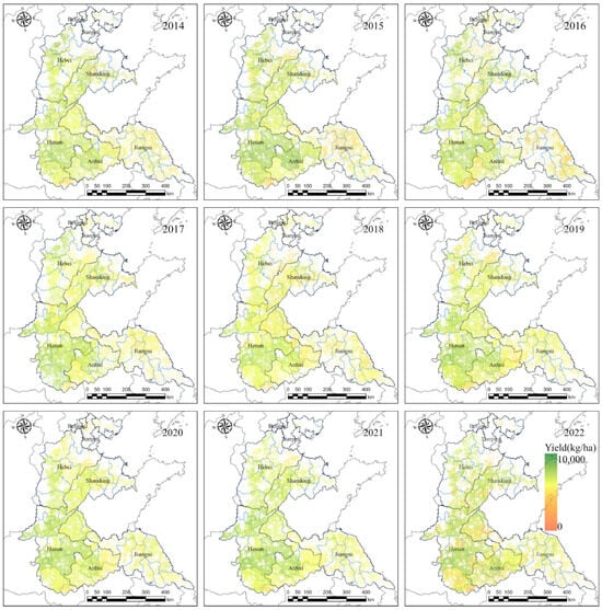 Figure 5 presents the estimated winter wheat yield across the HHH Plain from 2014 to 2022. The results reveal spatial and temporal variability in wheat yield. Over the study period, a general upward trend in regional yields was observed, accompanied by a gradual expansion of high-yielding areas. As the yield distribution maps are derived from wheat distribution data, annual spatial patterns exhibit variability, reflecting not only interannual changes in yield levels but also shifts in the spatial extent of wheat cultivation.