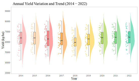 Temporal variation in municipal winter wheat yields in the Huang-Huai-Hai Plain from 2014 to 2022. Different colors represent different years.