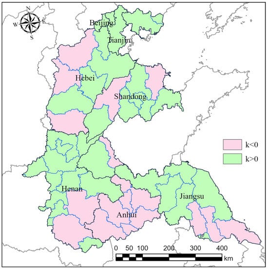 Linear yield trends in each municipality of the Huang-Huai-Hai Plain from 2014 to 2022. k represents the slope of the linear regression.