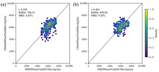 In Figure 8a, the HHHWheatYield20/30 m dataset exhibits an r of 0.549 with the GlobalWheatYield4 km dataset, along with an RMSE of 708.53 kg/ha and an MRE of 8.85%. In Figure 8b, the comparison with the ChinaWheatYield30 m dataset yields an r of 0.464, an RMSE of 699.80 kg/ha, and an MRE of 9.20%. These results indicate measurable alignment between HHHWheatYield20/30 m and both datasets, as reflected in the correlation coefficients and error metrics, capturing shared yield estimation trends across spatial scales.