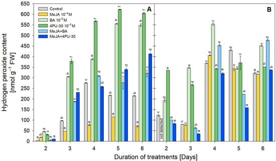 Alterations of hydrogen peroxide content in zucchini cotyledons grown on solutions of methyl jasmonate (MeJA) and cytokinins (BA, 4PU-30) alone or in combination under dark (A) and light (B) conditions. Different small letters indicate significant differences between treatments within each experimental group for each experimental day.