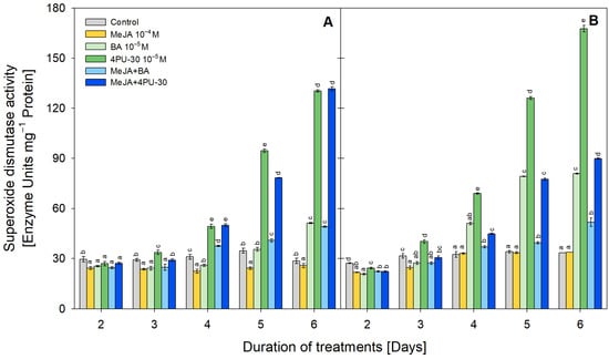 Alterations of superoxide dismutase activity in zucchini cotyledons grown on solutions of methyl jasmonate (MeJA) and cytokinins (BA, 4PU-30) alone or in combination under dark (A) and light (B) conditions. Different small letters indicate significant differences between treatments within each experimental group for each experimental day.