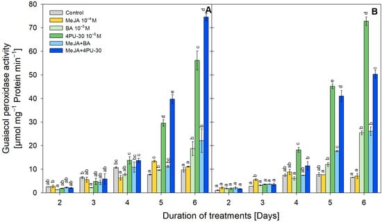 Alterations of guaiacol peroxidase activity in zucchini cotyledons grown on solutions of methyl jasmonate (MeJA) and cytokinins (BA, 4PU-30) alone or in combination under dark (A) and light (B) conditions. Different small letters indicate significant differences between treatments within each experimental group for each experimental day.