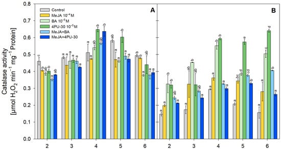 Alterations of catalase activity in zucchini cotyledons grown on solutions of methyl jasmonate (MeJA) and cytokinins (BA, 4PU-30) alone or in combination under dark (A) and light (B) conditions. Different small letters indicate significant differences between treatments within each experimental group for each experimental day.