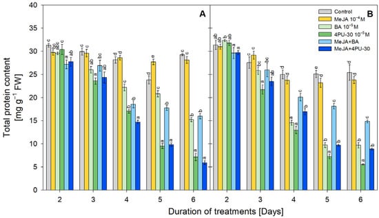 Alterations of total protein content in zucchini cotyledons grown on solutions of methyl jasmonate (MeJA) and cytokinins (BA, 4PU-30) alone or in combination under dark (A) and light (B) conditions. Different small letters indicate significant differences between treatments within each experimental group for each experimental day.