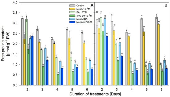 Alterations of free proline content in zucchini cotyledons grown on solutions of methyl jasmonate (MeJA) and cytokinins (BA, 4PU-30) alone or in combination under dark (A) and light (B) conditions. Different small letters indicate significant differences between treatments within each experimental group for each experimental day.