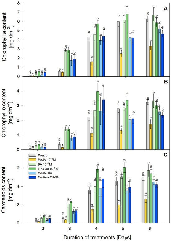 Alterations of chlorophyll a (A), chlorophyll b (B) and carotenoids (C) content in zucchini cotyledons grown on solutions of methyl jasmonate (MeJA) and cytokinins (BA, 4PU-30) alone or in combination under light. Different small letters indicate significant differences between treatments within each experimental group for each experimental day.