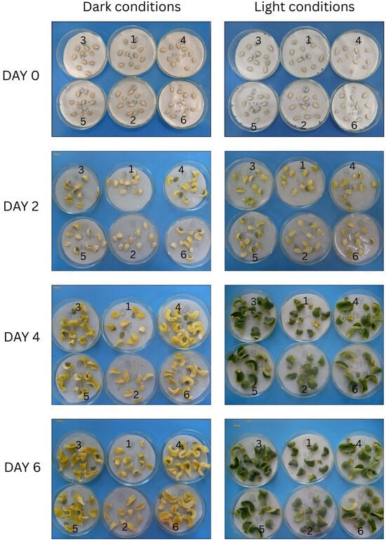 Images of cotyledons grown under dark and light conditions are presented in Figure 8. The comparison between treatments on each day revealed that starting from the 2nd day, both CKs applied alone enlarged the size of the cotyledons grown in dark and light regimes. Cotyledons treated with MeJA only did not have visible differences from the control ones. This tendency was valid till the end of the experiment, with the exception of the 6th day, when MeJA caused a slight cotyledon enlargement. In addition, starting from the 2nd day, greening of cotyledons cultivated under light condition was visually observed and corresponded to the alterations of photosynthetic pigments shown in Figure 7. MeJA in combined variants slightly retarded the cotyledon growth induced by CKs.