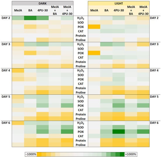 Under light conditions (Figure 4B), the values of enzymatic activity stayed higher in MeJA-only-treated cotyledons during the entire experiment, although the increase was not significant. At first, the individual application of both CKs—BA and 4PU-30 enhanced the enzymatic activity by 120%. This tendency continued till the end of the testing period, when the highest activity was caused by 4PU-30 (311%). Starting from the 4th day, MeJA significantly decreased the cytokinin-induced CAT activity, especially in combination with the phenylurea type of cytokinin.