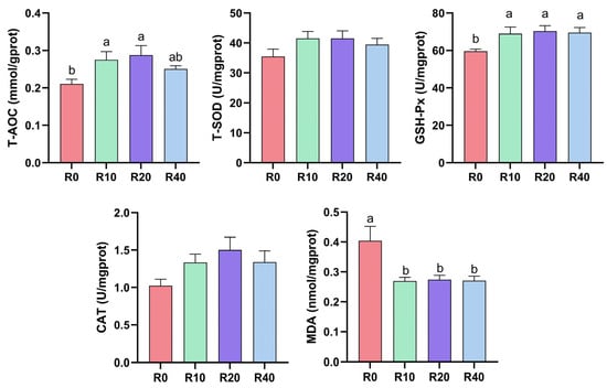 As shown in Figure 1, compared with the R0 group, the activity of T-AOC in the R10 and R20 groups increased significantly (p < 0.05). Additionally, the MDA content in the R10, R20, and R40 groups was significantly reduced (p < 0.05), while the GSH-Px activity in these groups significantly increased (p < 0.05). However, there was no significant difference in MDA content among the three experimental groups (Figure 1).