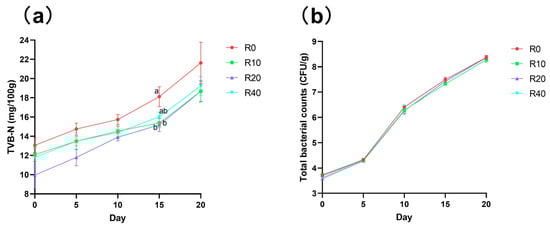 As shown in Figure 2a, compared with the R0 group, the TVB-N values of the R10 and R20 groups were significantly lower on the 15th day (p < 0.05). According to the national standard ‘fresh and frozen carcass mutton’ (GB/T9961-2008) [], the TVB-N value should be ≤15 mg/100 g. The order of time exceeding this standard was: R0 group > R40 group > R10 group > R20 group (Figure 2a).
