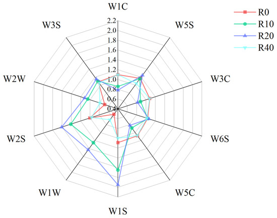 Radar plots of volatile flavor compounds detected by electronic nose at varying RYC addition levels. Groups: R0 (basal diet), R10 (basal diet + 10 g RYC/day), R20 (basal diet + 20 g RYC/day), and R40 (basal diet + 40 g RYC/day). Sensors and their corresponding sensitive materials: W1C (aromatic hydrocarbons), W5S (nitoxides), W3C (ammonia), W6S (hydride), W5C (olefins, aromatics, polar molecules), W1S (ethers), W1W (sulfide), W2S (alcohols, some aromatic compounds), W2W (aromatic components, organic sulfides), and W3S (ethers, aliphatic). n = 6 for each group.