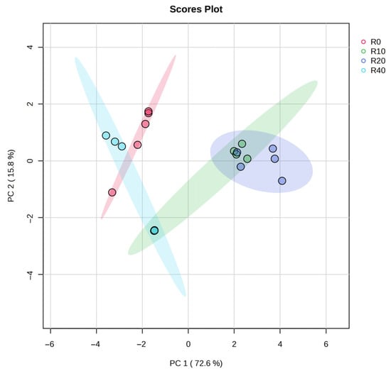 As shown in Figure 4, principal component analysis (PCA) of the PEN3 electronic nose data for the four lamb groups revealed that the first two principal components (PC1 = 72.6%, PC2 = 15.8%) collectively accounted for 88.4% of the total variance (Figure 4). The groups showed clear separation in the principal component space. The R0 group formed a distinct cluster, with the other three groups located in adjacent regions. Notably, the R20 group exhibited the greatest separation distance from R0 along the PC1 axis.