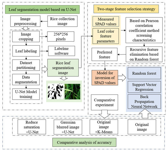 In this study, we propose a rice leaf SPAD machine vision inversion method that incorporates deep learning and feature optimization in response to the shortcomings of the existing machine vision techniques in leaf SPAD inversion, which are applicable only to leaves with simple backgrounds. First, to construct the rice leaf dataset, the U-Net network with a jump connection structure was used as the segmentation model to achieve efficient and precise segmentation of rice leaves in a complex field background. Then, to extract the leaf color feature values, we combined the Pearson correlation coefficient method and the RFE method to carry out two-stage feature optimization and screened out the color feature parameters suitable for SPAD inversion. Finally, the establishment of a SPAD inversion model for rice leaves on the basis of the ML framework enabled the accurate estimation of SPAD values in rice leaves. Figure 3 illustrates the technical roadmap of this research.