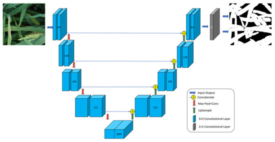The U-Net network is a widely used classical network in the computer vision field. The structure of U-Net consists of symmetric upsampling and downsampling segments, and the upsampling and downsampling segments are connected by a jumping connectivity layer. Because of this symmetric arrangement, the network forms a U-shaped structure and is thus named the U-Net network. The core concept of the U-Net network is to utilize a convolutional neural network to extract key characteristics from the input image and then recover the spatial resolution of the image through the upsampling operation in the decoder part and combine it with the high-resolution feature information in the encoder to achieve accurate image segmentation. In the training process, the training set of rice leaf images is input for training, and the leaf segmentation results are output. This process can be regarded as an adaptive image segmentation method. By continuously optimizing the model parameters, the accuracy and robustness of segmentation are progressively enhanced, resulting in segmentation outcomes that more closely approximate the true morphology of leaves. Ultimately, leaf segmentation images are obtained. Figure 4 illustrates the architectural diagram of the U-Net network.