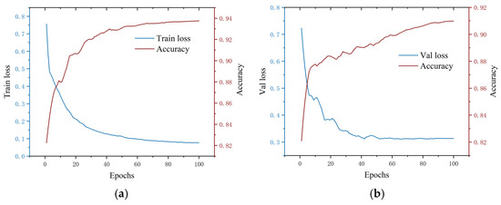 (a) Trend of the loss value and accuracy during the model training process. (b) Trend of the loss value and accuracy during model validation.