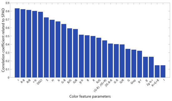 The 26 color feature values of all the rice leaf images were obtained on the basis of the color space, and the correlation coefficients between the original feature parameters and the SPAD values of the leaves were calculated via the Pearson correlation coefficient method. A higher coefficient indicates that the corresponding feature plays a more significant role in estimating leaf SPAD values. The following diagram illustrates the ranking of correlation magnitudes between 26 leaf color characteristic parameters and SPAD values.