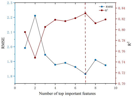 In this study, an RF-RFE method was employed to analyze the features initially selected through the aforementioned PCC approach, thereby determining the importance of each feature. The results of the importance ranking of the features via random forest are shown in Figure 9. On this basis, the RFE algorithm based on RF is utilized for iterative training in the model, and the variation curves of R2 and RMSE in each round are obtained, as shown in Figure 10. As shown in Figure 10, the RMSE fluctuates more when the number of features is lower, indicating that the model is less stable, and with an increasing number of features, the RMSE shows a decreasing trend and reaches a relative minimum of 1.814 at seven features, indicating that the model’s prediction error is the smallest at that moment and that the performance is optimal. The R2 serves as a crucial indicator for evaluating model fit, with values approaching one signifying a more robust and accurate model. When the number of features is increased to seven, R2 reaches a peak of 0.830, indicating that the model currently has the strongest ability to fit the data. As the number of color features increases, the improvement in R2 is not significant and even slightly decreases, which may be due to the introduction of redundant features leading to overfitting. Therefore, seven characteristic parameters, S, R-B, r, H, r-b, R/B, and DGCI, which can effectively predict the trend of leaf SPAD values, were selected.