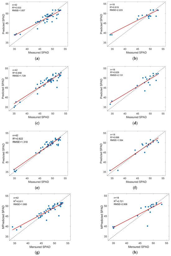 Comparison of inverse models for chlorophyll content SPAD values. (a) RF training set. (b) RF test set. (c) SVM training set. (d) SVM test set. (e) BPNN training set. (f) BPNN test set. (g) XGBoost training set. (h) XGBoost test set.