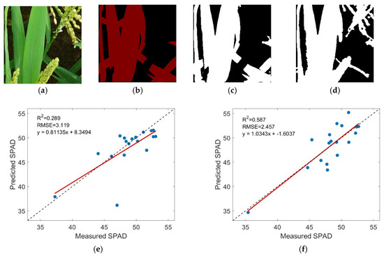 Inversion of SPAD values for chlorophyll content under different partitioning scenarios. (a) Raw image. (b) Labeled image. (c) U-Net result. (d) K-means result. (e) Raw image SPAD inversion accuracy. (f) K-means segmentation SPAD inversion accuracy.