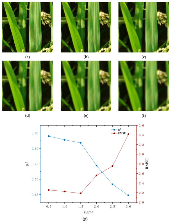 As shown in Figure 13, when the Sigma value is 0.5, the R2 value of the model is close to 0.84, and the RMSE is lower, which indicates that the model can extract the SPAD change rule more accurately under the condition of low fuzziness. When the Sigma value increases to 1.5–2.5, the R2 value decreases significantly and approaches 0.7, whereas the RMSE increases gradually, which indicates that the predictive accuracy of the model decreases gradually with an increasing degree of fuzziness. At a Sigma value of 3, R2 decreases to 0.65, and RMSE increases to 3.4, which indicates that in the presence of higher levels of ambiguous interference, the color eigenvalues of the leaves are affected, thereby leading to inaccurate prediction of SPAD by the model. Nonetheless, the model proposed in this study is still able to provide some degree of predictive power at higher levels of ambiguity, and even with a Sigma value of 3, the model is still able to approximately predict the SPAD value. This indicates that the inversion model has some robustness and can adapt to the interference of image blurring to some extent, providing more reasonable SPAD inversion results.