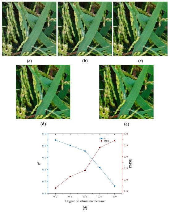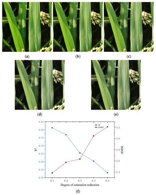 As shown in Figure 15, the accuracy variation in the chlorophyll SPAD inversion model under the condition of increased image saturation is presented. With an increasing saturation degree of the image, the performance of the model clearly decreases. Specifically, R2 gradually decreases with increasing saturation, from a high value close to 0.85 to a low value of approximately 0.45. In particular, when the increase in saturation exceeds 0.8, the downward trend is more significant. When the degree of increase in image saturation is 0.2, the R2 value of the model is close to 0.85, indicating that the model can accurately invert the chlorophyll SPAD value under this image saturation. When the degree of saturation increase in the leaf image is between 0.4 and 1.0, the R2 value gradually decreases and decreases to a minimum of 0.46, whereas the RMSE gradually increases and reaches 3.6. This indicates that the prediction accuracy of the model gradually decreases at this time. When the degree of saturation increase exceeds 0.8, the prediction error increases significantly. This indicates that when the image saturation of the model is relatively high, the prediction accuracy decreases significantly. When the degree of increase in image saturation is 0.8, although the R2 of the model decreases to 0.62 and the prediction accuracy decreases somewhat, the model can still extract effective features from the changing color feature values and make predictions, indicating that the proposed model has certain robustness and adaptability. This finding indicates that when the image saturation is increased within a certain range, the proposed inversion model can still effectively predict the chlorophyll content effectively.