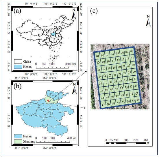 Location and experimental design of the study area. (a) Location of Henan in China; (b) boundary of Henan province; (c) maize experiment in the study area. ○, indicates that the maize in the plot has not emerged.