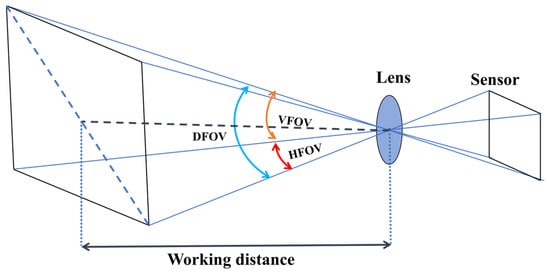 Accurate calculation of the actual leaf area of maize requires consideration of the field of view (FOV), as it influences both the range of leaves captured by the camera and the assessment of lighting conditions. FOV is determined by the lens focal length and the size of the image sensor [41]. By considering the distance between the object and the camera, the pixel size in the image can be estimated, which enables the calculation of the plot dimensions, as illustrated in Figure 3.