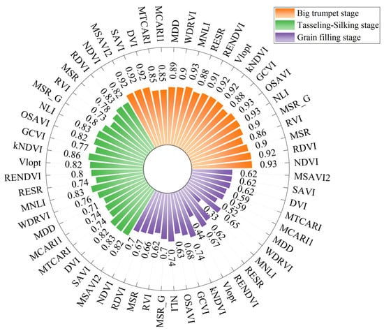 Correlation coefficients between vegetation indices and measured LAI at three different stages.