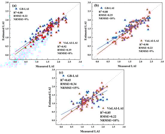 Regression scatter plot of measured LAI versus estimated LAI using GB model and VisLAI model. (a) Big trumpet stage; (b) tasseling–silking stage; (c) grain filling stage. The dashed line represents the 1:1 diagonal. GB-LAI: LAI estimated by the GB model; VisLAI-LAI: LAI estimated by the VisLAI model.