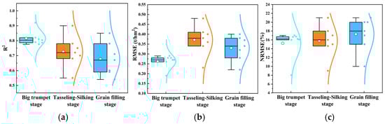 As the growing season progresses, the R2 for both models gradually declines. This decrease can be attributed to the later stages of maize growth, particularly during the maize reproductive phase, when significant changes in leaf color occur, transitioning to yellow [65]. These dynamic variations in leaf color influence the models’ prediction accuracy. During the maturity phase, the complexity of photosynthesis and changes in leaf pigments further reduce the models’ interpretability, leading to a decline in the R2 value. The RMSE initially increases before decreasing, with this fluctuation likely resulting from variations in maize growth at different stages, especially during transitional stages when uneven growth rates and biomass distribution introduce errors. During the early and mid-growth stages, maize development is relatively uniform, leading to smaller errors. In contrast, as maize approaches maturity in the later stages, factors such as leaf yellowing [66], biomass changes [65], and increased uncertainty in observational data contribute to higher RMSE values. However, as the model adapts to these changes, error values decrease, resulting in a subsequent reduction in RMSE. The NRMSE shows a gradual increase across the three growth stages. This trend suggests that, as the maize progresses through its growth stages, the model progressively adapts to the dynamic changes, becoming more capable of addressing the complexities and evolving characteristics of the growth process in the later stages.