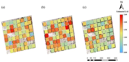 Spatiotemporal distribution of LAI in summer maize across different growth stages. (a) Big trumpet stage; (b) tasseling–silking stage; (c) grain filling stage.