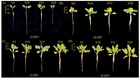 Phenotypic changes in sugar beet seedlings under different nitrogen treatments at 10 (A), 20 (B), 25 (C), and 30 (D) days post-treatment (DPT).