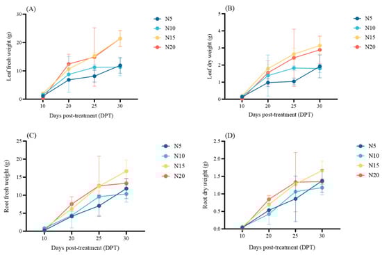 Effects of different nitrogen treatments on leaf fresh weight (A) and dry weight (B), and root fresh weight (C) and dry weight (D) of sugar beet at 10, 20, 25, and 30 DPT.