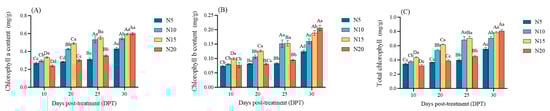 Changes in chlorophyll a (A), chlorophyll b (B), and total chlorophyll (C) contents in sugar beet under different nitrogen treatments at 10, 20, 25, and 30 DPT. Different lowercase letters indicate that there are significant differences in different nitrogen concentrations on the day; different capital letters indicated that the same N concentration was significantly different at different times, p < 0.05.