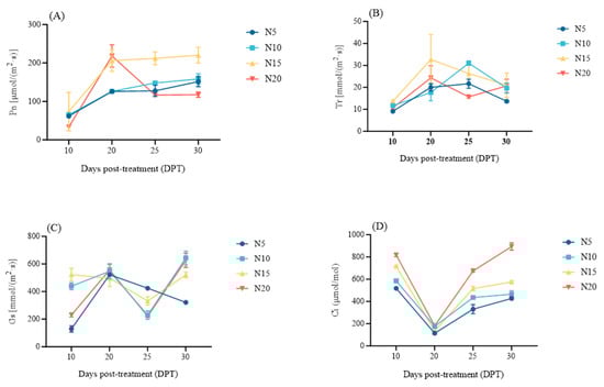Dynamics of photosynthetic parameters in sugar beet under differential nitrogen supplies at 10, 20, 25, and 30 DPT. (A) net photosynthetic rate (Pn), (B) transpiration rate (Tr), (C) stomatal conductance (Gs), (D) intercellular CO2 concentration (Ci).